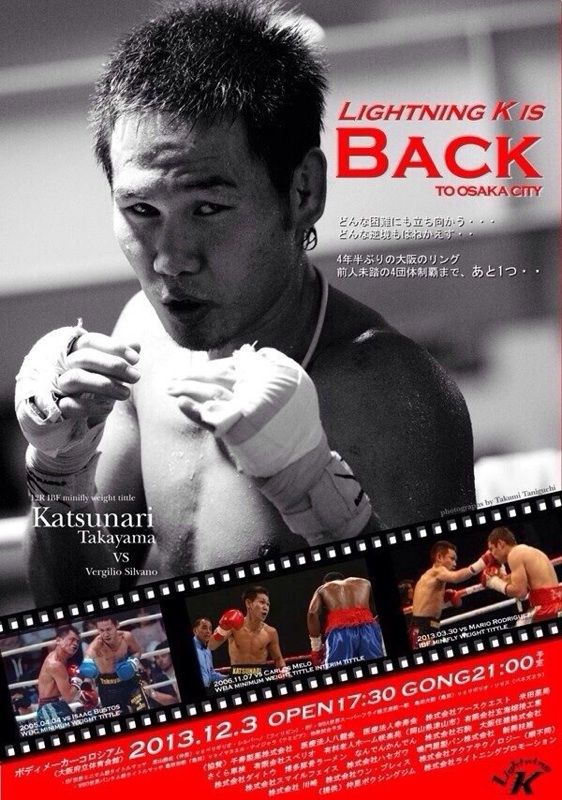 IBF Minimumweight champion Katsunari Takayama makes his long awaited return to Japan as he competes on the up-coming Kameda card. Takayama, who hasn't fought in Japan since 2009 and hasn't fought in Osaka 2008 seems to have some how gotten his own poster for the show.